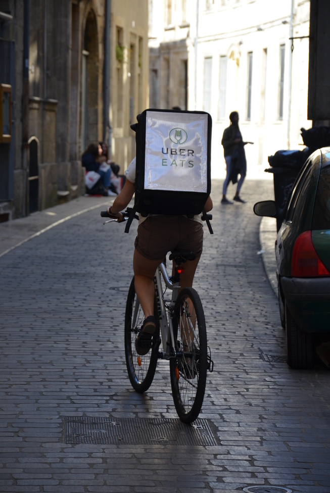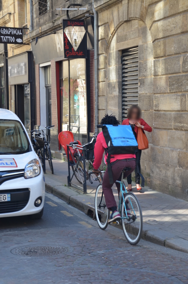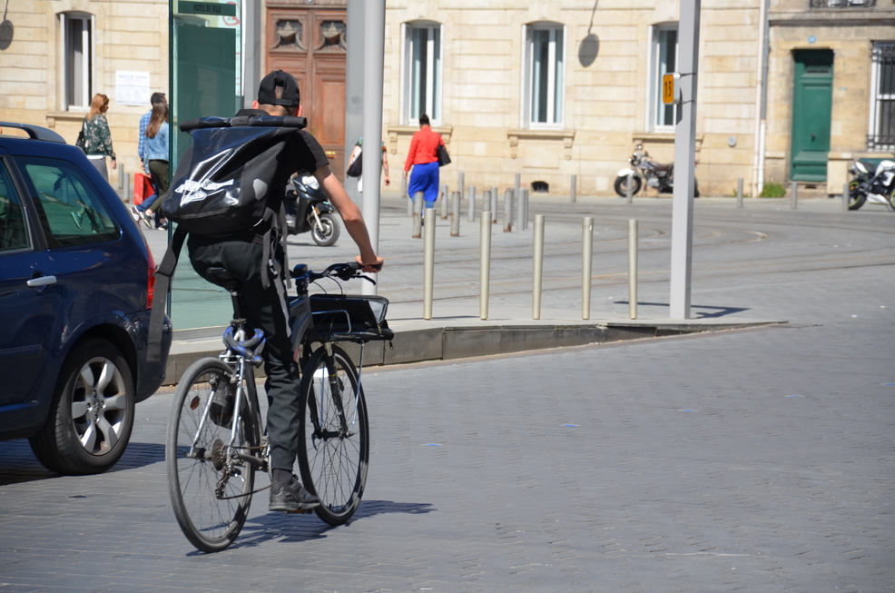 À Bordeaux, on croise des livreurs à vélo, particulièrement aux heures des repas.