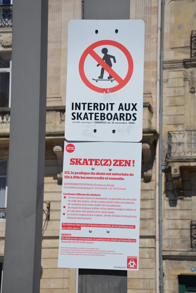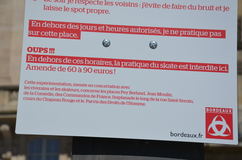 Sur cette même place, la place Pey-Berland, la pratique du skate est réglementée. Les skateurs du parvis de la cathédrale Sainte-Croix ignorent sans doute le degré de liberté dont ils bénéficient.