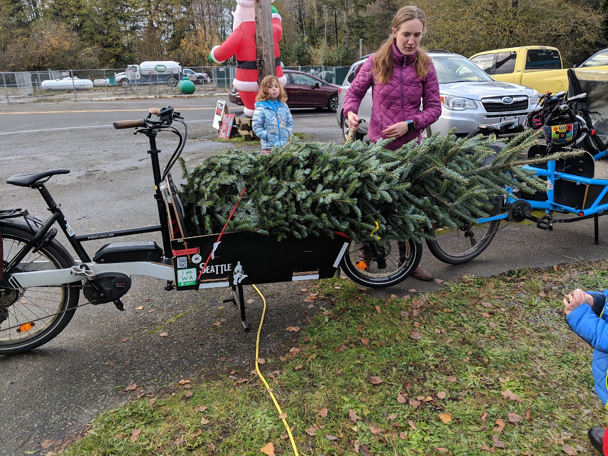 Au mi-temps de ma grossesse, mon ventre était devenu plutôt proéminent et les petits gestes du quotidien comme enfiler ses chaussures devenaient plus difficiles. Les douleurs intercostales et aux hanches que j’avais ressenties au cours de ma deuxième grossesse commençaient à se manifester. Au troisième trimestre s’est ajoutée une douleur à la symphyse pubienne. Lors de ma deuxième grossesse, le phénomène des hanches et symphyse pubienne douloureuses était aggravé par la marche, en particulier en montée, si bien que je m’inquiétais de savoir si faire du vélo aboutirait au même résultat. J’ai été heureuse de constater que ce n’était pas le cas. Au contraire, faire du vélo avait tendance à atténuer la douleur. Je suppose que c’est en partie dû à l’aide de l’assistance électrique pour lancer le vélo. En l’absence d’assistance ou en repartant sur un braquet trop important, la douleur se manifestait. Le fait que le vélo me maintenait les jambes et les hanches alignées a dû aussi jouer. Là où j’ai eu le plus mal c’est lorsque la zone du Puget Sound a été enneigée en février et que j’ai dû marcher et prendre le bus plus fréquemment. Marcher sur la glace, avec les pieds qui chassent vers l’extérieur, était très douloureux et à mon grand soulagement ça n’a duré que deux semaines. Faire du vélo a aussi soulagé mes douleurs intercostales et m’a plus généralement fait oublier cette sensation de transporter une pastèque dans l’abdomen. A vélo j’ai une position relevée et ma ceinture abdominale est mobilisée, ce qui soulage mes côtes sans me causer de mal de dos (un problème courant chez les hommes assis toute la journée qui essaient de soulager leur cage thoracique en se tenant droit). Cette position faisait presque disparaître mon ventre, du moins jusqu’à ce que j’ai besoin de descendre de selle aux feux en heurtant ma sacoche de cintre !