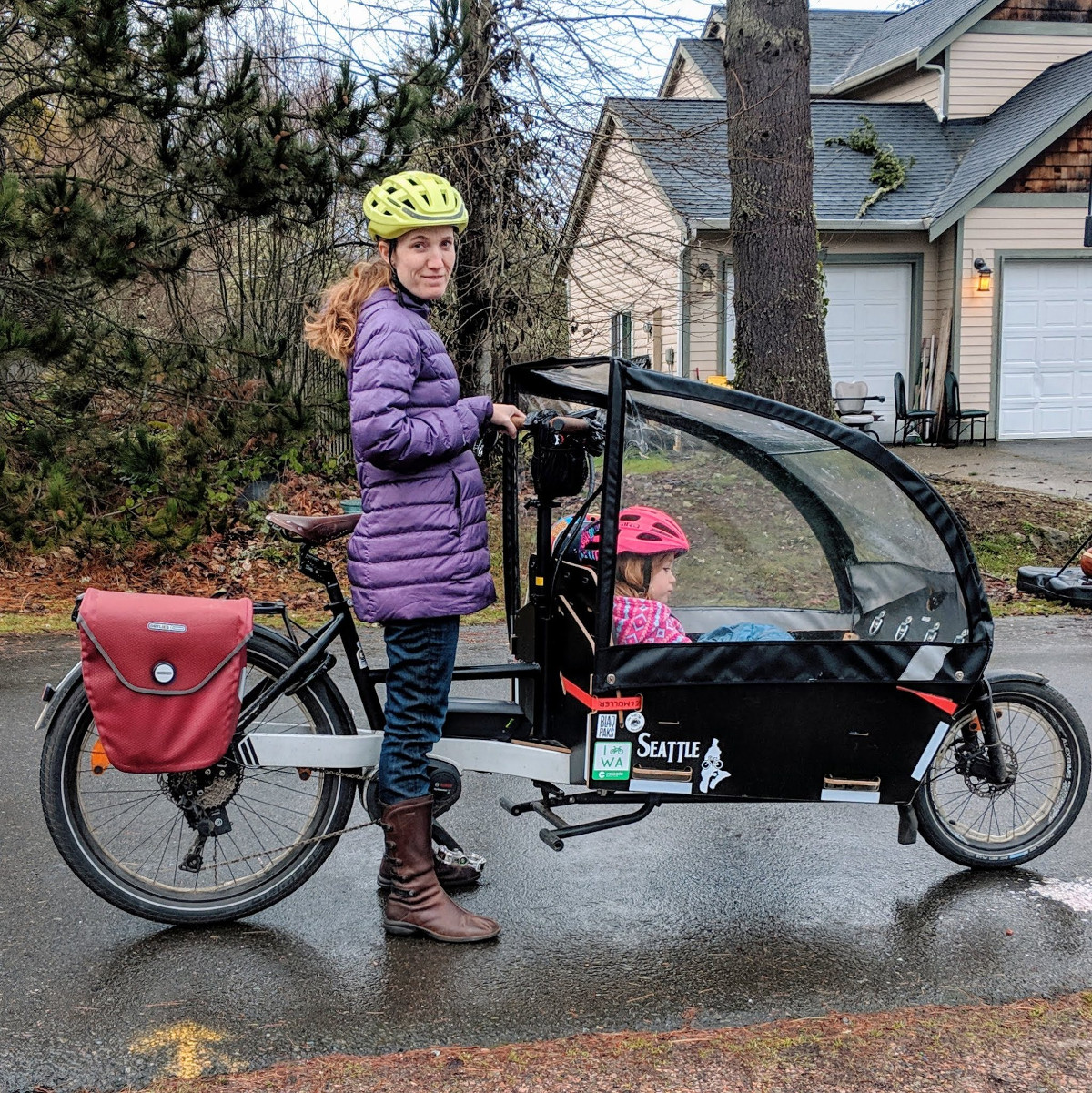 Mes deux vélos m’ont parfaitement accompagné pendant ma grossesse, bien que j’ai préféré le GSD au Packster les derniers mois4. Plus lourd, il n’était pas mon vélo habituel, si bien que je me sentais un peu moins à l’aise à son guidon. Ma dernière sortie à vélo a eu lieu le vendredi où je suis entrée dans ma 39ème semaine, trois jours avant d’accoucher. J’ai pris le water taxi5 pour me rendre en ville à ma dernière visite médicale, je suis passée par le bureau déposer des papiers relatifs à mon congé maternité, puis j’ai repris la longue route du retour pour attraper le ferry de Fauntleroy via Alki. Au total j’ai pédalé près de 6500 km pendant ma grossesse, la plupart du temps avec un enfant à bord. J’ai ainsi pu apprécier pleinement le vélo comme outil de mobilité, en particulier dans sa version à assistance électrique, magique.