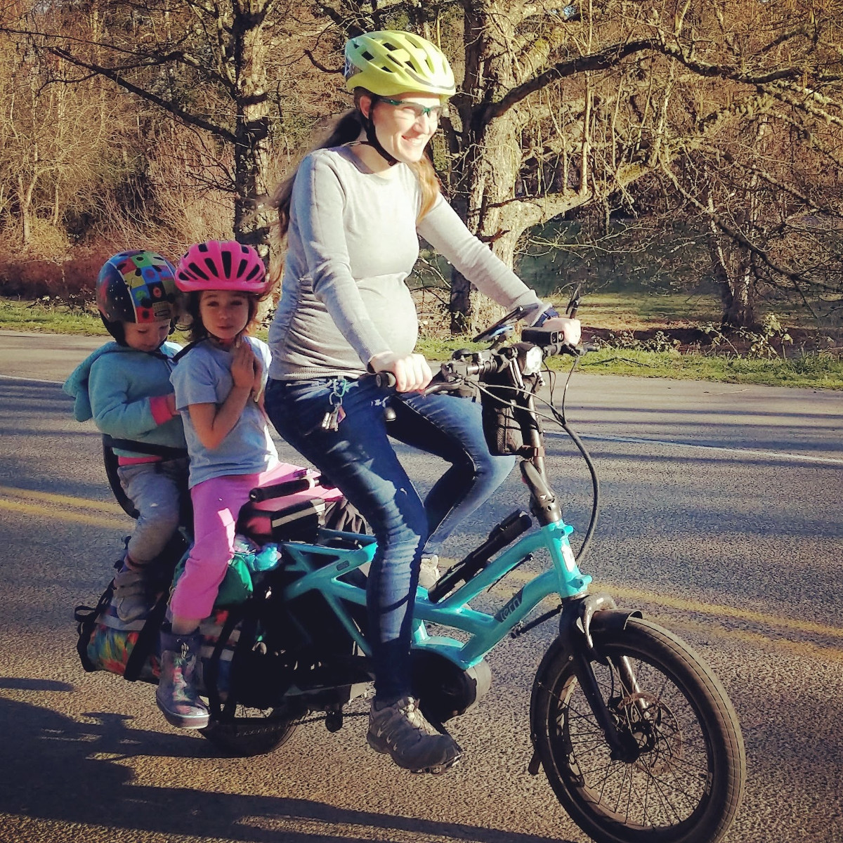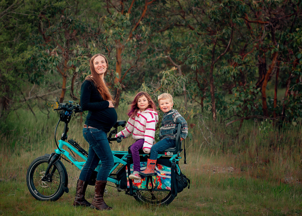 Le travail et l’accouchement se sont globalement bien passés, mais il se trouve que j’ai perdu beaucoup de sang si bien que je ne m’en suis pas remise aussi rapidement qu’avec mes deux autres enfants. Je me suis sentie bien sur le vélo plus tôt que je ne l’imaginais, et j’ai fait ma première sortie seulement cinq jours après l’accouchement, mais à cause de mon hémoragie il m’a fallu plus longtemps que prévu avant que je puisse faire des trajets plus longs sans finir épuisée. Garder la forme et rester active pendant la grosses ne signifie pas que donner naissance à un bébé soit une sinécure ! Pendant les tout premiers mois je devais sans cesse me rappeler que mon corps avait encaissé pas mal et que je devais y aller mollo. C’est en ce sens que l’assistance électrique sur les vélo-cargos est à la fois une bénédiction et une malédiction. C’était génial en ceci qu’elle me permettait de pédaler sans me fatiguer outre mesure, quand je n’oubliais pas de me ménager. Mais parfois elle m’entraînait à fournir plus d’effort que je n’aurais dû, me laissant sur le carreau pendant plusieurs jours. C’était en soi une leçon instructive de découvrir combien l’assistance électrique peut brouiller l’écoute de son propre corps.