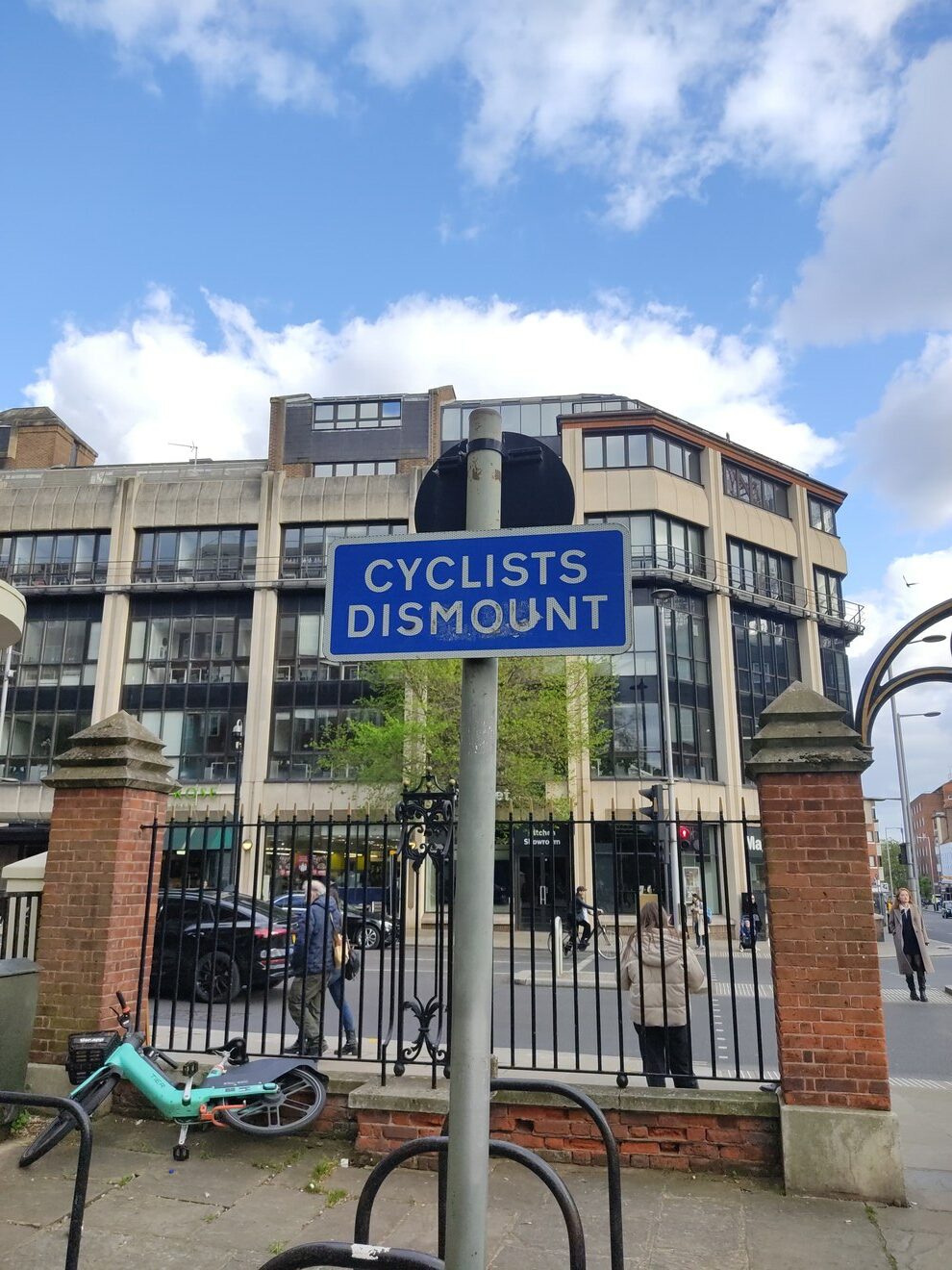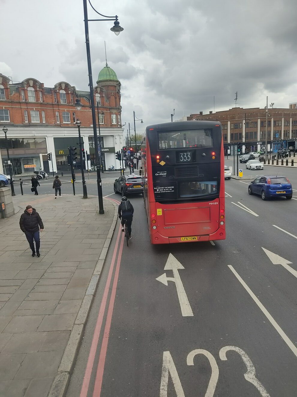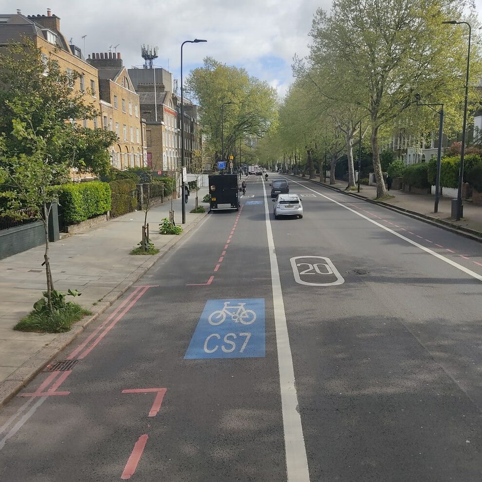 Le marquage bleu CS7 indique qu’on se trouve sur l’itinéraire de la Cycle Superhighway 7 (le tout premier aménagé à Londres). Que de la peinture ici :