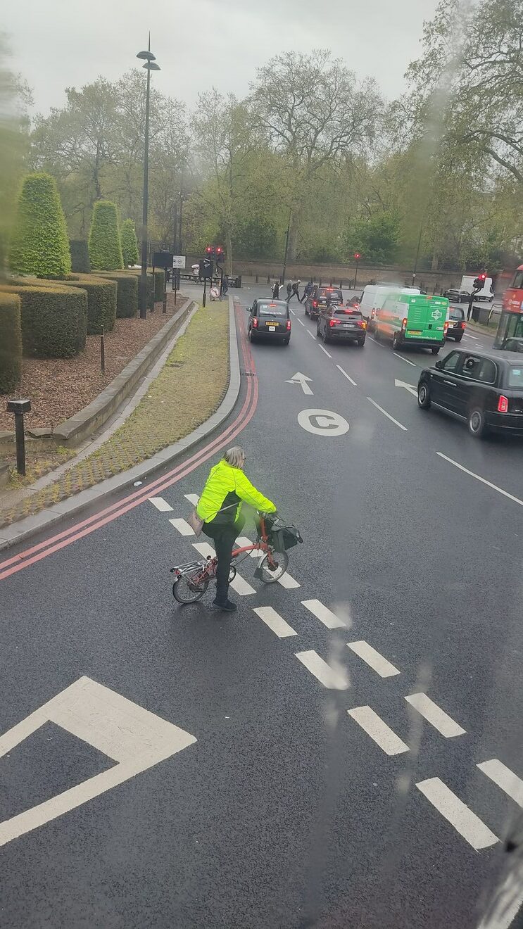 Je n’avais jamais traversé la Manche et je viens de passer presque une semaine à Londres. Après avoir traduit ici des blogueurs britanniques1, j’avais quelques images en tête de la capitale du Royaume-Uni. Il paraît que le trafic vélo un jour de semaine représente désormais dans le Grand Londres l’équivalent d’un tiers du trafic métro. Je l’ai lu dans l’Evening Standard, vénérable quotidien désormais distribué gratuitement dans les stations de métro. Est-ce que ça se voit sur place ? J’en ai le sentiment mais l’espace public est tellement vaste que les cyclistes sont globalement peu visibles. Comme à Marseille naguère, je n’ai pas pédalé dans cette ville très agréable à bien des égards – il eût fallu le faire à gauche. Le casque est très largement porté, et il m’a semblé que beaucoup de cyclistes sont en tenue sportive. Enfin, la chose qui saute aux yeux, c’est le nombre de Brompton en circulation.