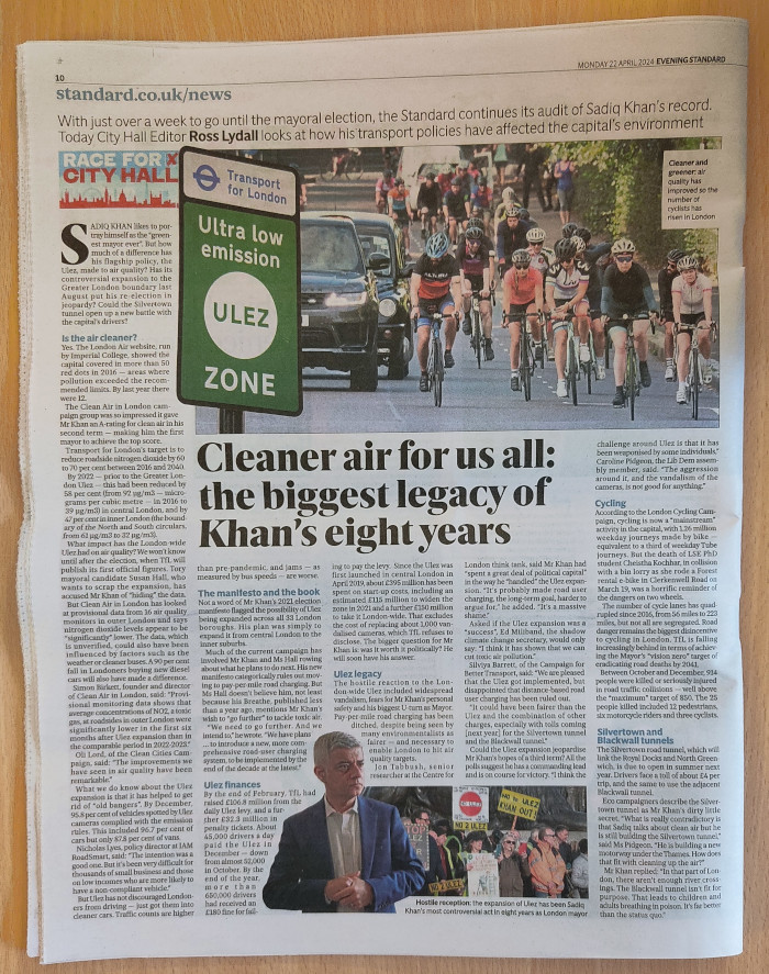 On retrouve en ligne l’article ci-dessus, et auquel j’ai fait allusion en intro, sous le titre « London mayoral election: How has Sadiq Khan’s Ulez and other green policies helped the capital? » (les Londoniens sont appelés à voter pour l’élection du maire à Londres après demain2). Il y a une partie consacrée au vélo qui tient en trois paragraphes dont voici une traduction :