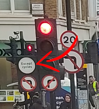 Je ne suis pas certain que la photo du Except bicycles soit un équivalent du M12 français. Le « Except bicycles » semble s’appliquer au panneau d’interdiction de tourner à gauche en dessous, pas au feu. Il y a une exception pour les cyclistes à l’interdiction de tourner à gauche faite à la circulation générale, mais pas d’autorisation de franchir le feu rouge.