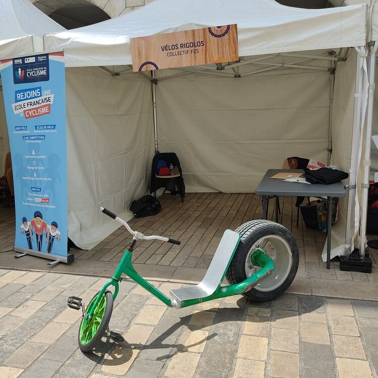 Une autre bonne idée de cette journée : avoir invité les vélocistes du centre-ville à présenter leurs modèles4. J’ai pu essayé plusieurs vélos. Très sympa. De même avec le Comité Départemental Handisport du Loiret qui avait mis à disposition des vélos adaptés, notamment un tandem côte-à-côte super maniable.