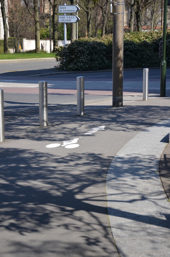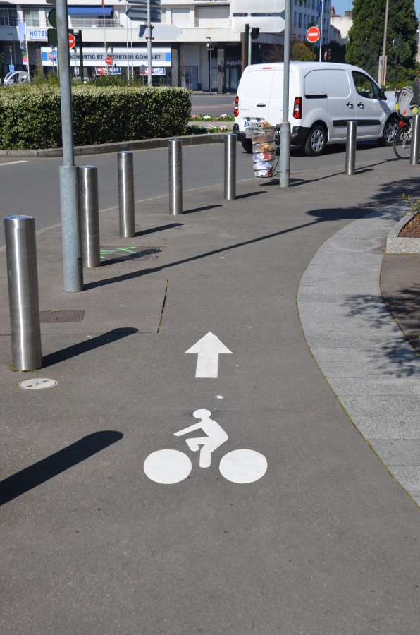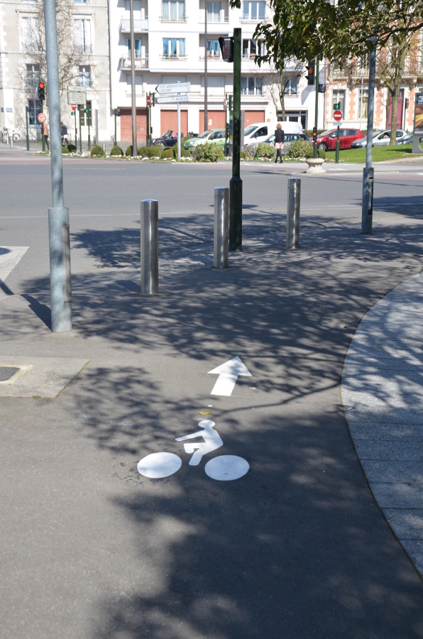 En revanche l’enthousiasme qui préside à leur soudaine multiplication laisse perplexe le cycliste qui a conscience d’utiliser un véhicule (article R311-1 du code de la route). Prenons le cas de la rue Bannier, là où elle débouche sur la place Gambetta. Les pictogrammes flambants neufs invitent le cycliste à monter sur le trottoir pour gagner trente mètres plus loin un passage piéton.