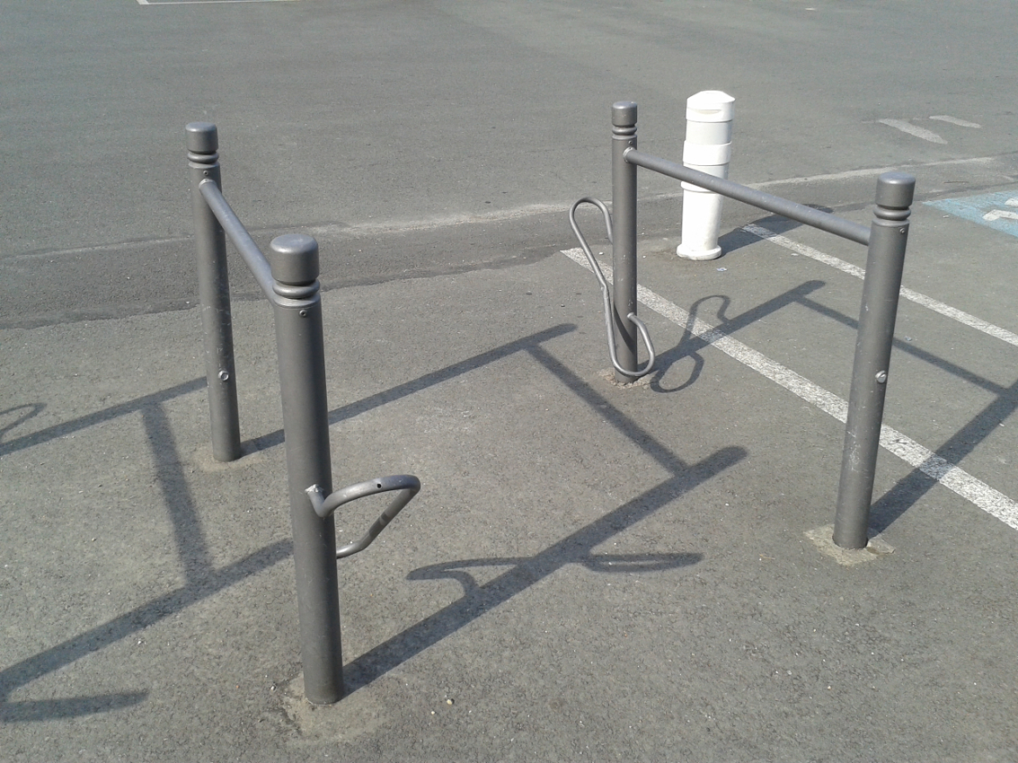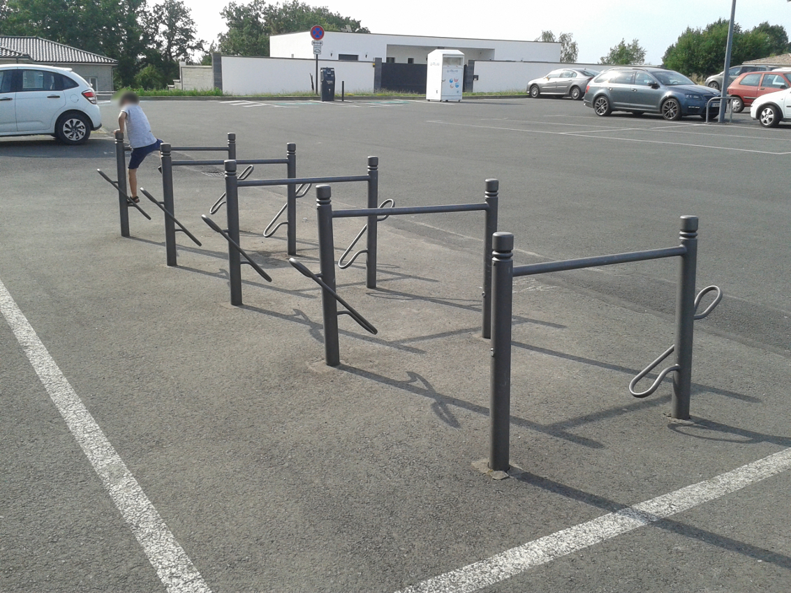 Devant le centre aqualudique Aquacap, à la sortie nord de la ville, des arceaux à repose-roue sont bien implantés mais ne sont pas terribles. Les plus utilisés (?) sont déjà cassés :